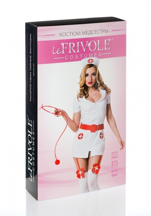 У этой медсестры один секс на уме! Прежде чем ставить укол, она раз десять шлёпнет ладошкой по попке пациента. А пользуясь стетоскопом, она то и дело опускается всё ниже и ниже – где не услышать стука сердца и шума в лёгких. И всё же эта похотливая медсестричка – истинная врачевательница. Кокетливо закусывая губу, глядя из-под пышных ресниц и нежно поглаживая тело кончиками пальцев, она заставляет пациента забыть обо всех недугах! Костюм состоит из: халатика с подвязками для чулок, головного убора, лакового ремня.