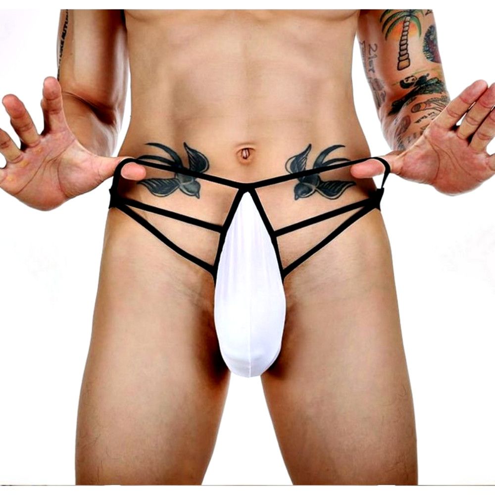 Белые сексуальные трусы-стринги на тонких черных бретелях.