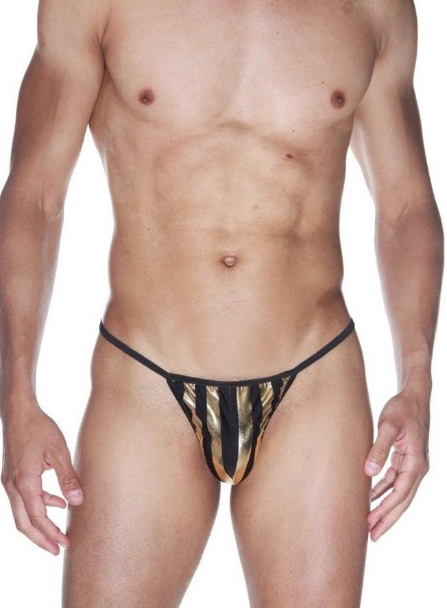 Классические стринги на очень тонких черных резинках, из черной ткани в широкую золотую полоску.
