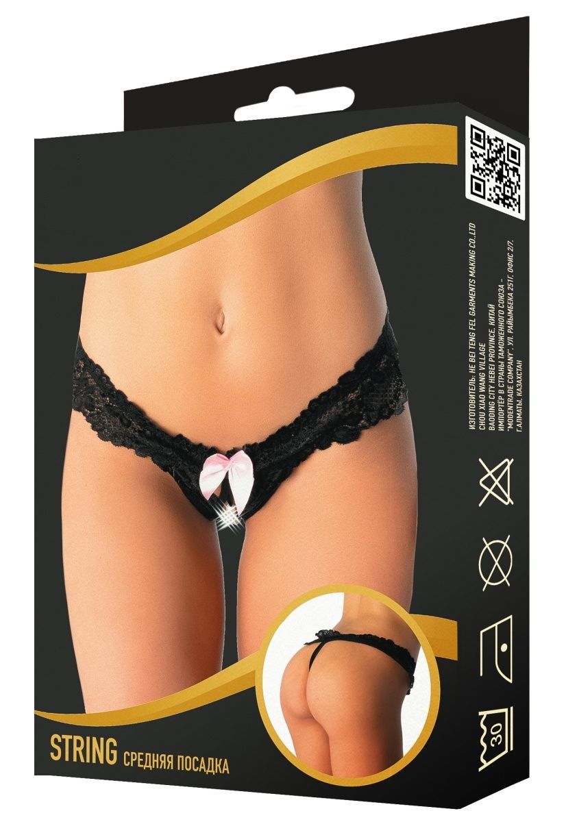 Оригинальные контактные кружевные трусики-стринги с контрастным бантиком. Средняя посадка.