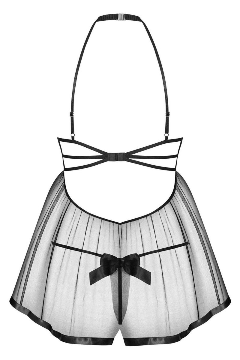 Озорная сорочка Delishya с открытыми чашками на косточках и тонком поддерживающем поролоне. Бретели регулируются по длине, на спинке застежка на крючки-петли. Сорочка декорирована атласными бантиками и дополнена несъемным чокером. В комплекте: сорочка, трусики-стринги.