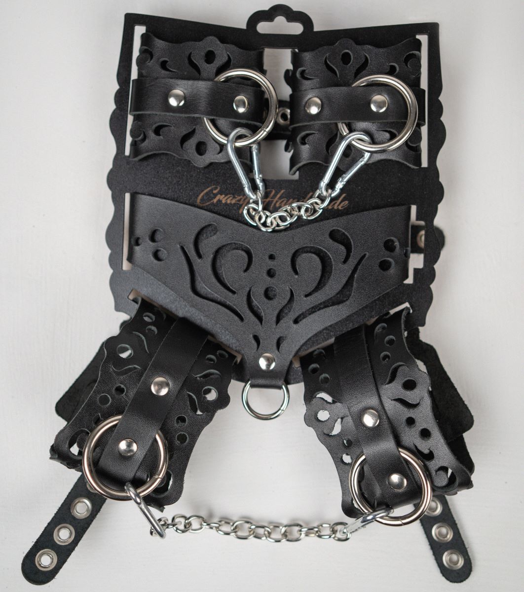 В набор входит ошейник, наручники и оковы. Доставляется в фирменной упаковке в виде брендированной деревянной подложки. Ошейник из натуральной кожи треугольной формы с декоративными резными узорами. На нижней части изделия расположено стальное хромированное кольцо. Наручники с авторским дизайном из натуральной кожи со стальным хромированным кольцом. Резные элементы придают атмосферу нежности, элегантности и подчеркивают красоту тела. Регулируются ремешком из натуральной кожи. В комплекте прочная соединительная цепочка с двумя карабинами. Оковы с авторским дизайном из натуральной кожи со стальным хромированным кольцом. Резные элементы придают атмосферу нежности, элегантности и подчеркивают красоту тела. Регулируются ремешком из натуральной кожи. В комплекте прочная соединительная цепочка с двумя карабинами. Длина ошейника - 44 см, ширина - 9 см, обхват - 32-41 см. Длина манжет наручников - 28 см, ширина - 7 см, обхват - 19-27 см. Длина манжет оков - 25,5 см, ширина - 7 см, обхват - 24-33 см.