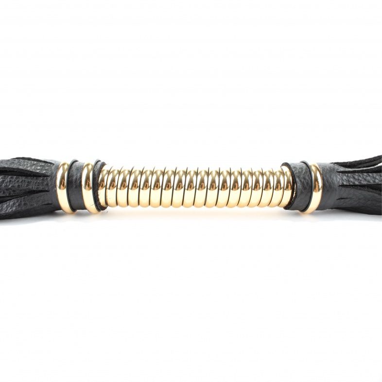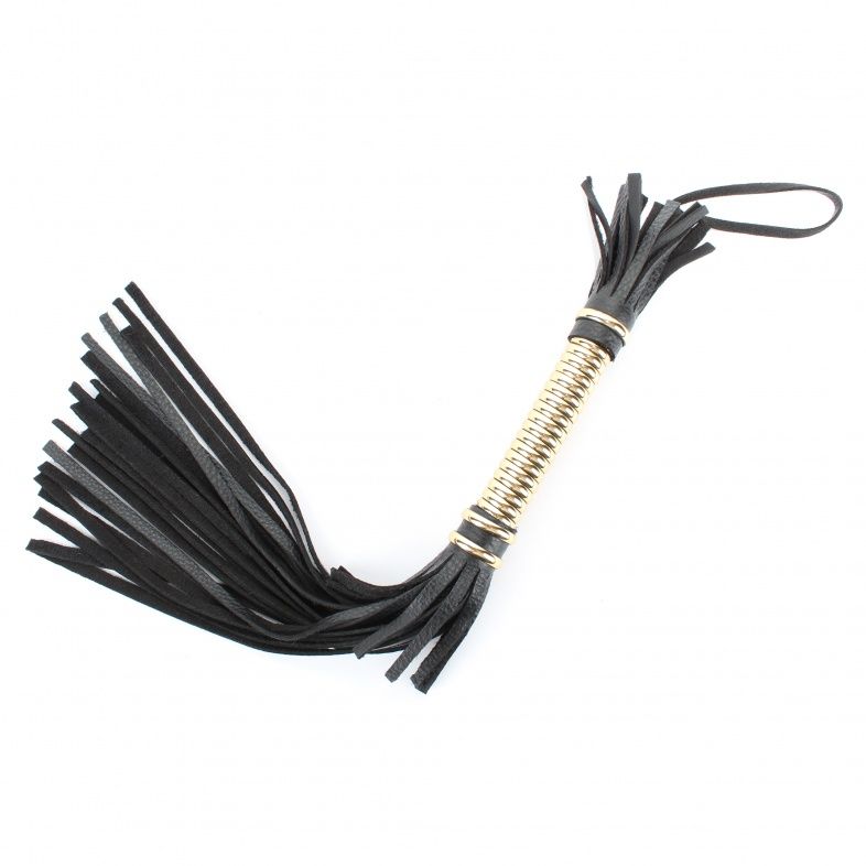 Чёрная кожаная плетка с золотистой рукоятью.