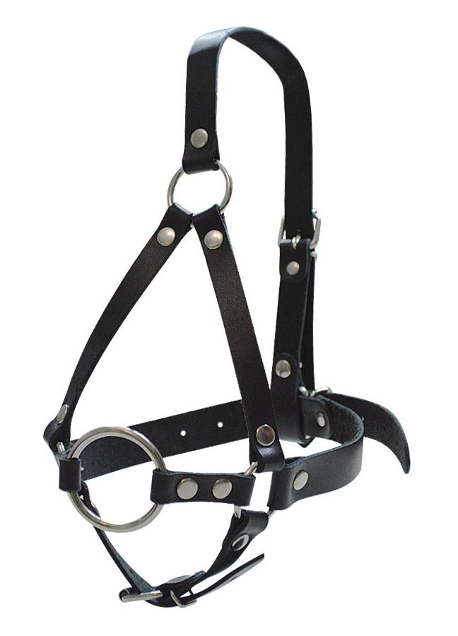 Кляп-рамка со сбруей на голову из черных кожаных ремешков.