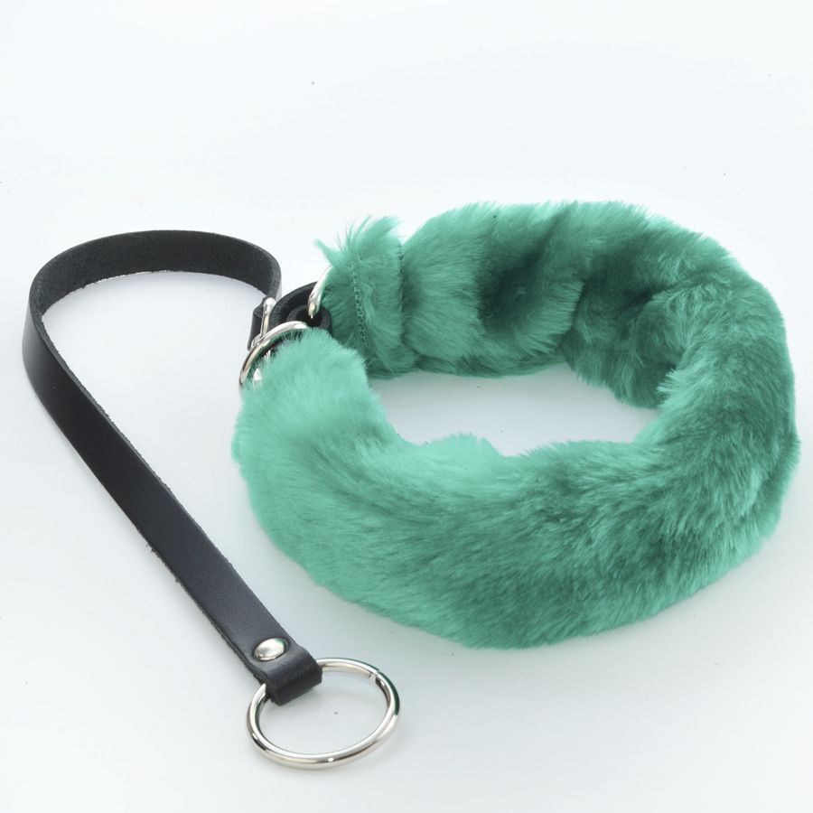 Зеленый меховой ошейник с кожаным поводком.